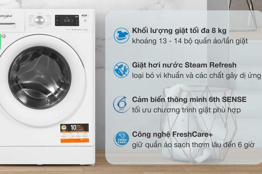 - Khối lượng giặt tối đa: 8 kg, máy giặt Whirlpool phục vụ tốt nhu cầu giặt giũ của gia đình có từ 3 - 5 người, hoặc các gia đình có ít thành viên hơn nhưng có nhiều quần áo cần giặt.