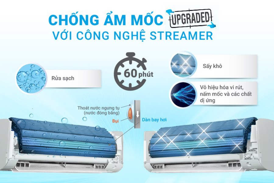 - Chức năng chống ẩm mốc được kết hợp công nghệ Streamer, khi máy tắt hoặc ngưng chức năng làm lạnh hoặc khử ẩm, máy sẽ tự động hoạt động ở chế độ chỉ chạy quạt trong 1 giờ để làm khô bên trong dàn lạnh nhằm làm giảm sự phát sinh nấm mốc và các mùi khó chịu, đem lại luồng không khí mát mẻ, ngoài ra còn giúp duy trì hiệu suất và tuổi thọ của dàn lạnh. Bên cạnh đó, luồng điện Streamer phóng ra vô hiệu hóa các chất độc hại như vi rút, nấm mốc và các chất gây dị ứng.