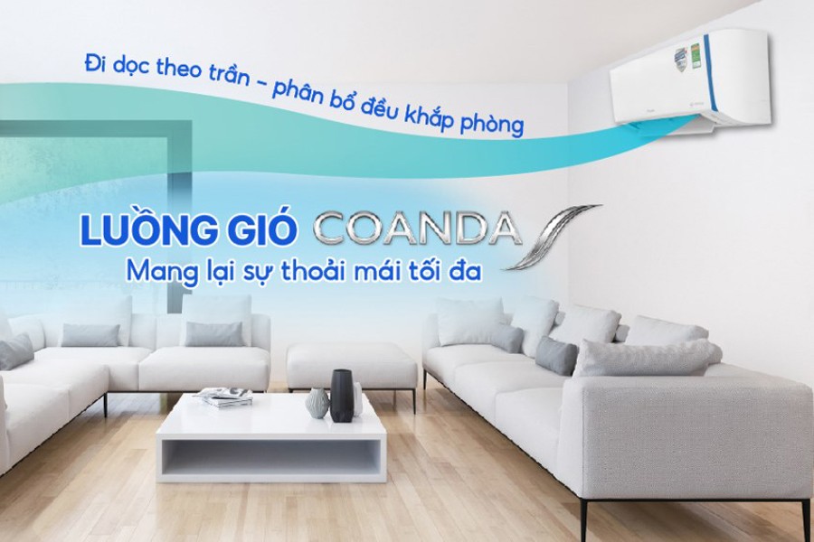 - Luồng gió thoải mái Coanda: với thiết kế đặc biệt khiến luồng hơi lạnh phả ra từ miệng gió được đẩy lên trần nhà rồi nhịp nhàng tỏa xuống, bao phủ toàn bộ khắp gian phòng nhờ đó tạo ra không gian mát lạnh dễ chịu và tránh tình trạng thổi trực tiếp vào người.