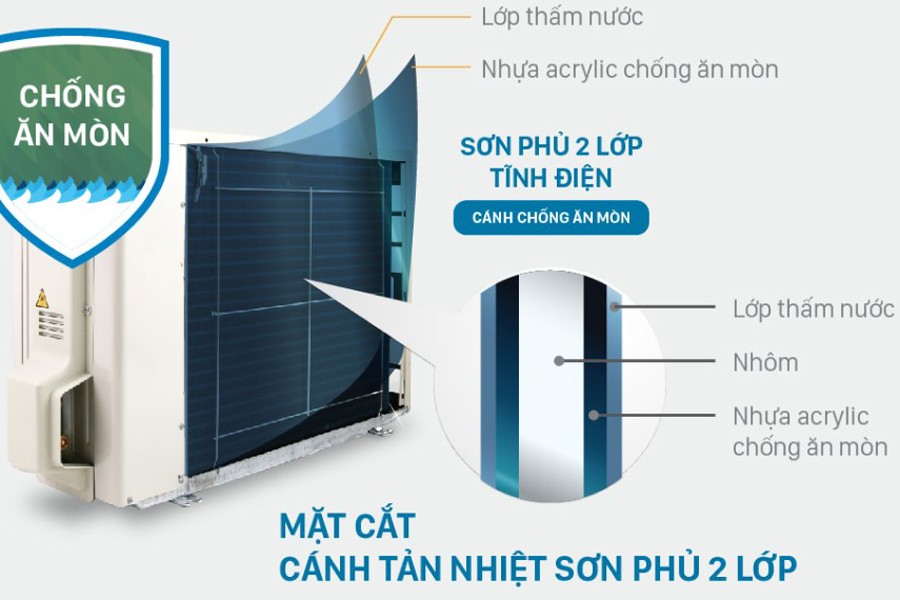 - Để hạn chế tình trạng bị ăn mòn bởi các tác nhân thời tiết, cánh dàn tản nhiệt sẽ được phủ 2 lớp tĩnh điện: lớp nhựa acrylic và lớp chống thấm nước để tăng khả năng chống mưa axit và sự ăn mòn của muối giúp cho thiết bị bền bỉ hơn.