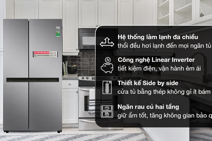 - Công nghệ Linear Inverter giúp tủ lạnh hoạt động bền bỉ, tiêu thụ ít điện năng nhưng vẫn giữ được hiệu quả làm lạnh cao.