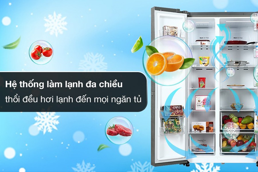 - Tủ lạnh LG sử dụng hệ thống làm lạnh đa chiều đem hơi lạnh đến mọi nơi phía trong tủ một cách nhanh chóng và đồng đều, bảo quản rau củ tươi ngon lâu hơn.